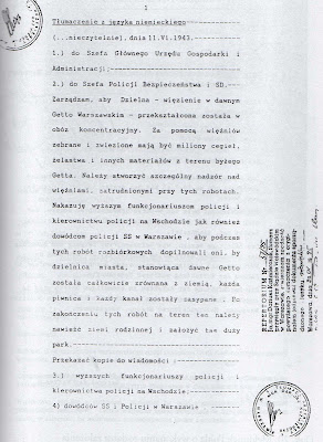 5. Rozkaz Himmlera z czerwca 1943 r.Nakazywał przekształcenie więzienia Pawiak przy ul. Dzielnej w byłym warszawskim getcie w obóz koncentracyjny. Rozkaz został skierowany do: "Szefa Głównego Urzędu Gospodarki i Administracji SS (WVHA), Szefa Sicherheitspolizei i SD, Wyższego Dowódcy SS i Policji na Wschód oraz Dowódcy SS i Policji w Warszawie". Według tego rozkazu przy pomocy więźniów należy zebrać i zachować miliony kamienia budowlanego, odpadki żelaza i inne materiały z byłego getta. Dzielnica getta ma być całkowicie zrównana z ziemią. Po zakończeniu tych prac należy nanieść ziemi i założyć duży park.