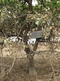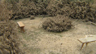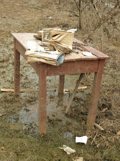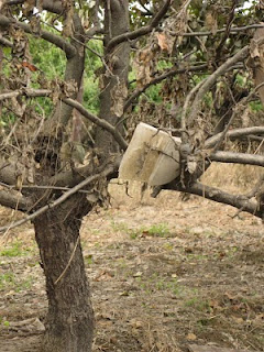 Krajobraz wojenny. Miejscami surrealistyczny. Na drzewach wiszą książki, butelki, pustaki...