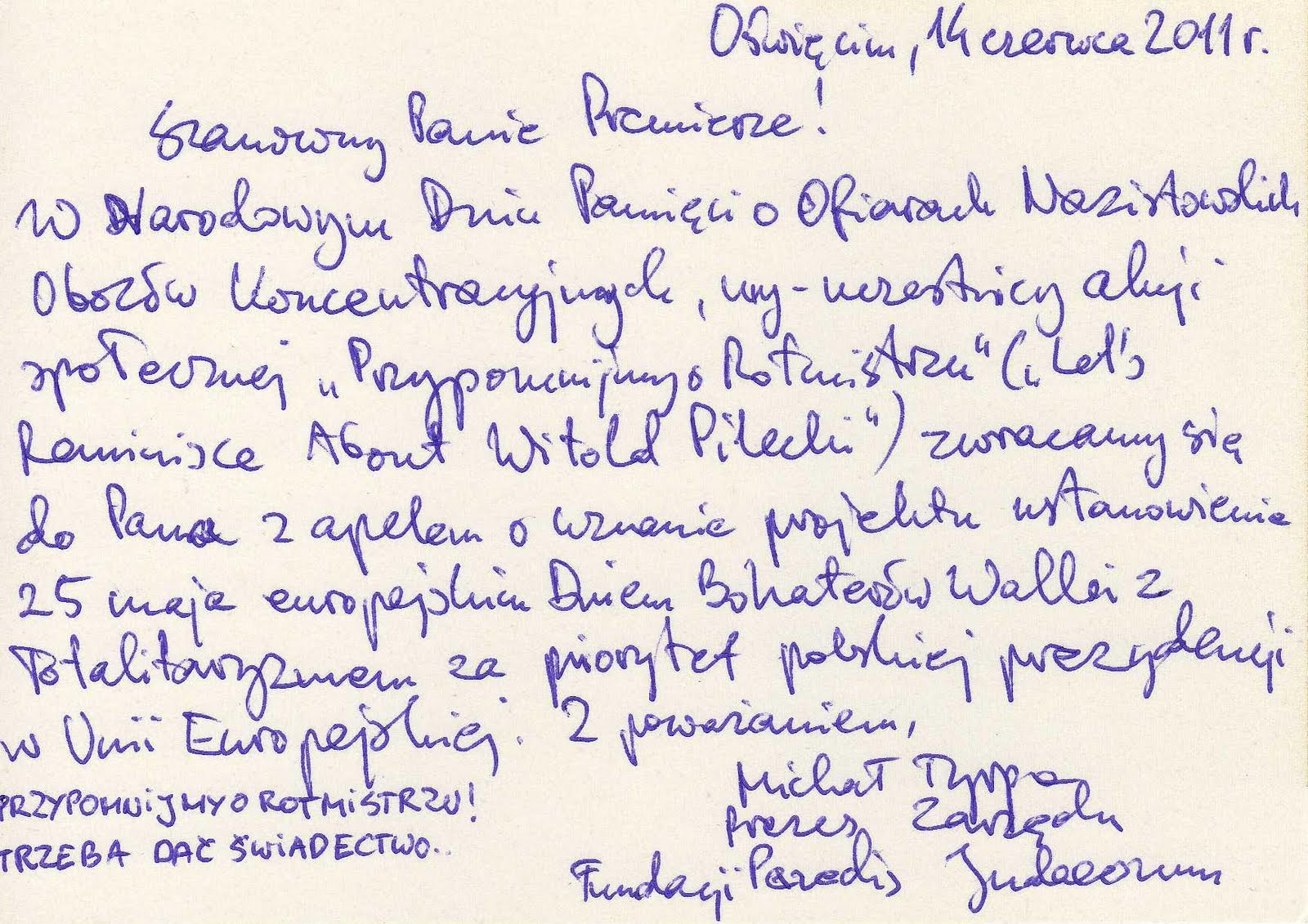 Do listu do premiera dołączona została także widoczna wyżej ulotka akcji „Przypomnijmy o Rotmistrzu”.