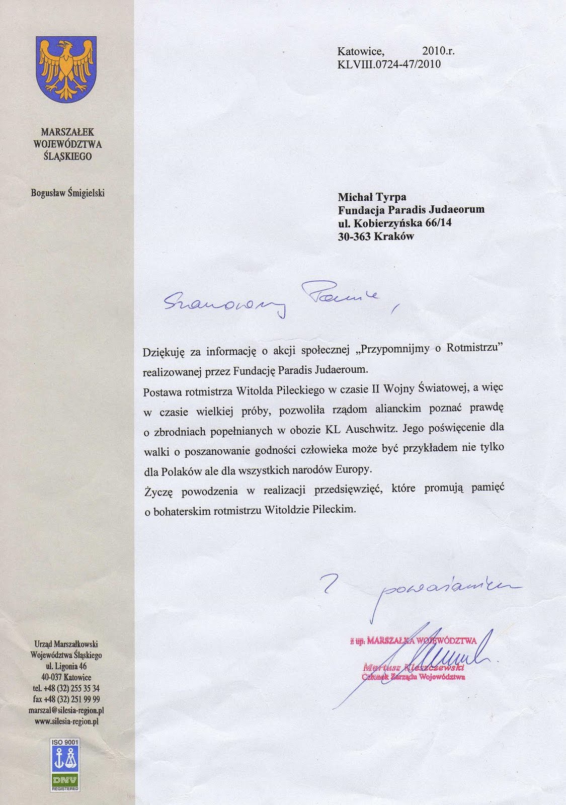 Na podstawie informacji opublikowanych pod adresem www.michaltyrpa.blogspot.com , wnoszę, że list ze wspomnianym apelem zdążył już do Pana Premiera dotrzeć. Jako uczestnik akcji społecznej "Przypomnijmy o Rotmistrzu" ("Let's Reminisce About Witold Pilecki") wyrażam zdecydowane poparcie dla apelu skierowanego do Pana 14 czerwca b.r. z byłego niemieckiego obozu koncentracyjnego Auschwitz.