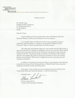 pragnę podziękować za pański ostatni list do Amerykańskiego Muzeum Holocaustu, który został mi przekazany celem udzielenia odpowiedzi. Jak pan może przypuszcza, Muzeum otrzymuje wiele propozycji dotyczących specjalnych ekspozycji, publicznych programów, lub zmian w naszej ekspozycji stałej na temat Holokaustu. Niestety, nie możemy spełnić oczekiwań wszystkich. Stwierdziwszy powyższe, zaznaczam, że Muzeum bardzo uważnie i gruntownie rozważa każdy poważny wniosek dotyczący wprowadzenia zmian w naszej ekspozycji, a za taką uznajemy pańską propozycję uhonorowania Witolda Pileckiego za jego działalność konspiracyjną w obozie koncentracyjnym Auschwitz podczas II wojny światowej. Ów proce pociąga za sobą obszerne badania istotnych monografii i artykułów naukowych, które zajmują się tym tematem, jak również badanie istniejących podstawowych materiałów źródłowych. Jakkolwiek tego rodzaju czynności pochłaniają wiele czasu, są one niezbędne i podyktowane rozwagą. Dodatkowo zamierzam przekazać pański list moim kolegom w Muzeum, tak aby byli oni świadomi pańskich wysiłków i dokonań Witolda Pileckiego w obozie koncentracyjnym i centrum mordowania Auschwitz-Birkenau. Raz jeszcze chciałbym panu podziękować za propozycję i zainteresowanie Muzeum Holocaustu. Życzę wszelkiej pomyślności. Z poważaniem,