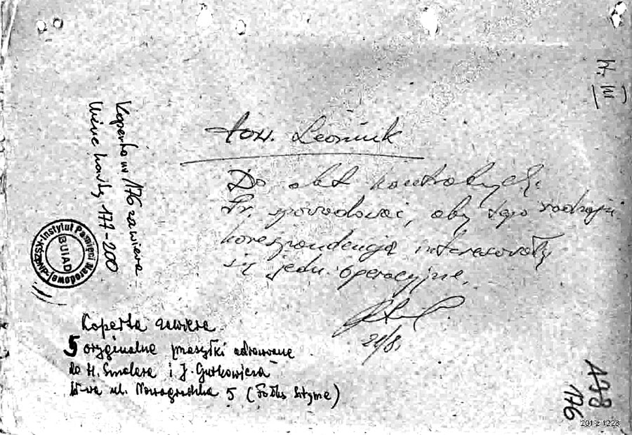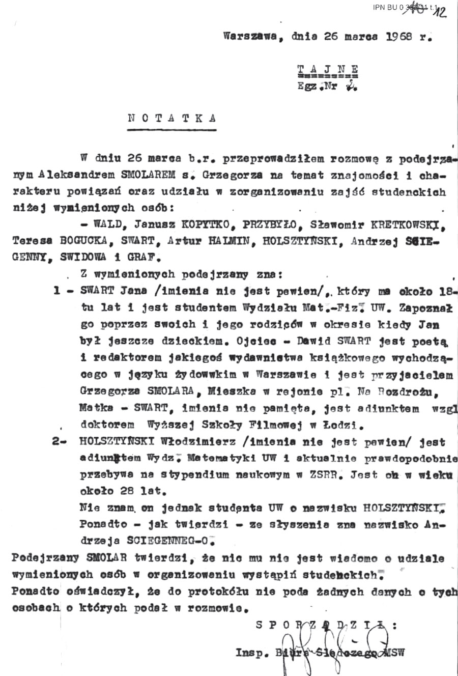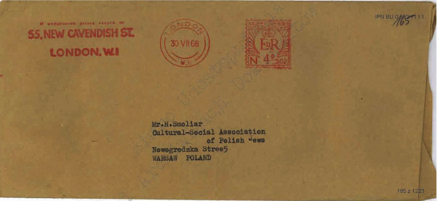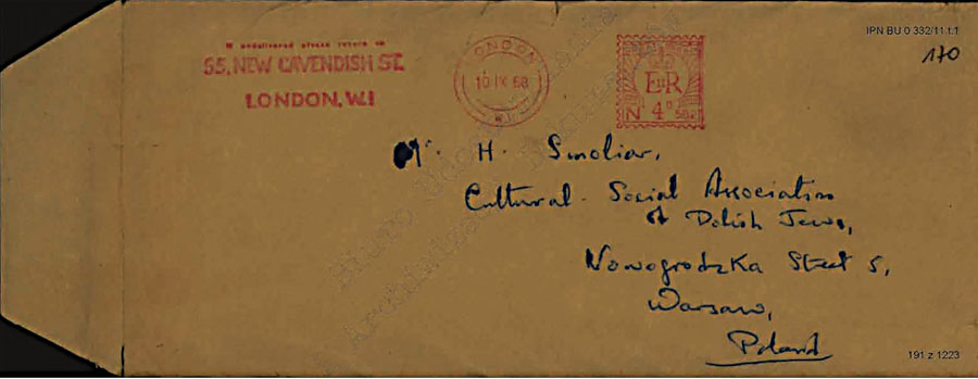 Prokurator Prokuratury Wojewódzkiej dla m. st. Warszawy działając na mocy postanowienia z dnia 4.IV.1968 r. w sprawie Nr II 2 Ds 14/68 w przedmiocie zajęcia korespondencji wychodzącej i przychodzącej na adres: Grzegorz Smolar, Warszawa (usunięte przez redakcję) – na zasadzie art. 145§ 1 kpk. Dokonał otwarcia przesyłki skierowanej napowyższy adres. Przesyłka została nadesłana przez Urząd Wymiany Poczty Warszawa 3 przy piśmie z dnia 15 maja 1968 r.