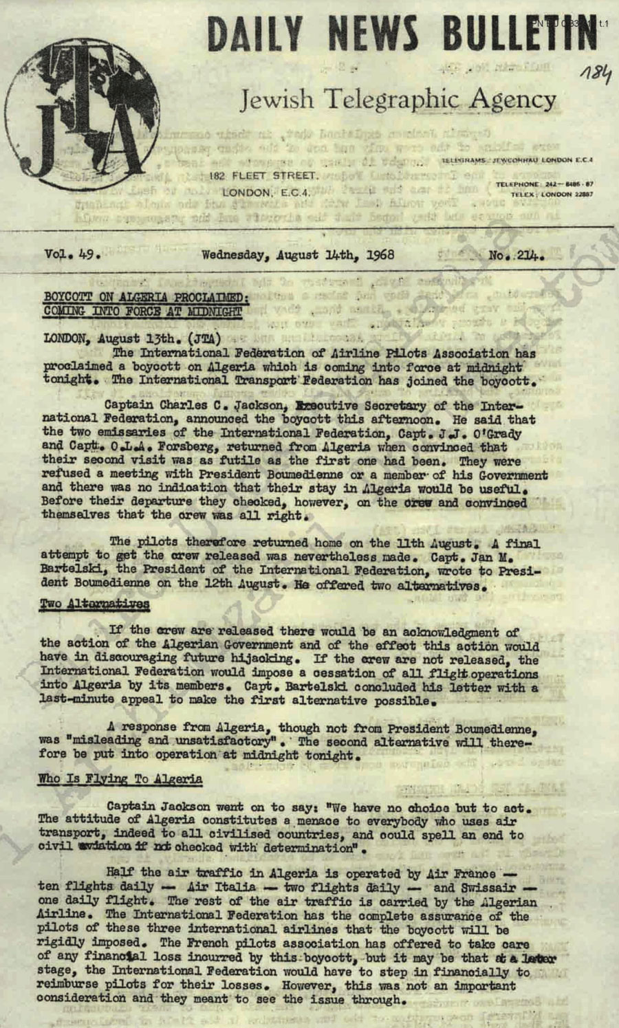 - (nieczytelne) poinformował ambasadora francuskiego i włoskiego, że zwróci Izraelowi samolot o ile Izrael zwolni przynajmniej 4-5 Arabów palestyńskich uwięzionych za działalność terrorystyczną. Amerykańskie Towarzystwo Podróży domaga się akcji zmierzających do natychmiastowego zwrotu Izraelowi samolotu, załogi i pasażerów.