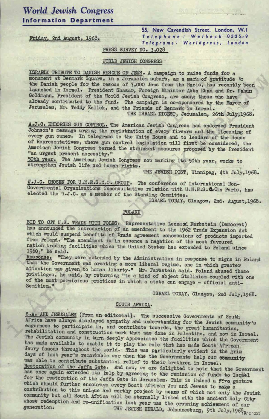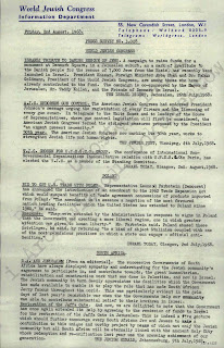 - Światowy Kongres Żydowski zwrócił się z apelem do (nieczytelne) o pomoc w umożliwieniu emigracji prześladowanej mniejszości żydowskiej na Środkowym Wschodzie. Społeczności żydowskie we wszystkich krajach diaspory wstrząśnięte są odmową (nieczytelne) odnośnie wysłania przedstawicieli ONZ na Środkowy Wschód, celem zbadania sytuacji mniejszości żydowskiej. Egipt, Irak i Syria hołdując faszystowskiej doktrynie (nieczytelne) można robić zamieszkałą na swoim terenie mniejszość narodową co się chce, gwałcić międzynarodowe prawa człowieka, Egipt trzyma w więzieniach setki Żydów. Traktuje się ich w brutalny sposób. Po 12 miesięcy siedzą i nie robi się procesów.