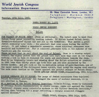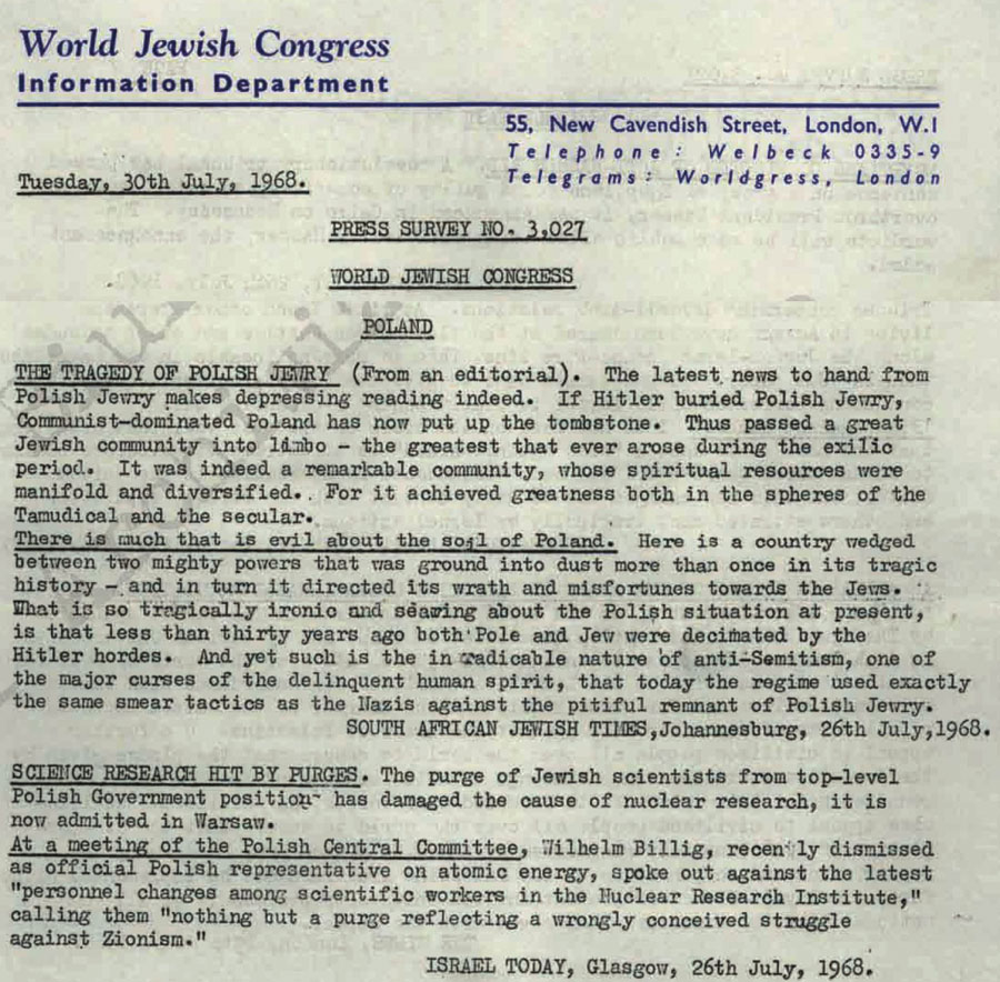 Oto arcyciekawa garść publikacji rodem z IPN-u świadcząca o powiązaniu środowiska żydowskiego w Polsce z międzynarodowym żydostwem. Taka postawa umożliwiała, głównie amerykańskim Żydom, dyskredytowanie Polski w oczach światowej opinii publicznej. Warto także pamiętać, iż wielu, bardzo wielu, ok. 1/3 marcowych emigrantów, to byli stalinowscy zbrodniarze, opluwający Polskę i Polaków do chwili obecnej. Przykładem może być J. T. Gross (jego donosy na przyjaciół tutaj).