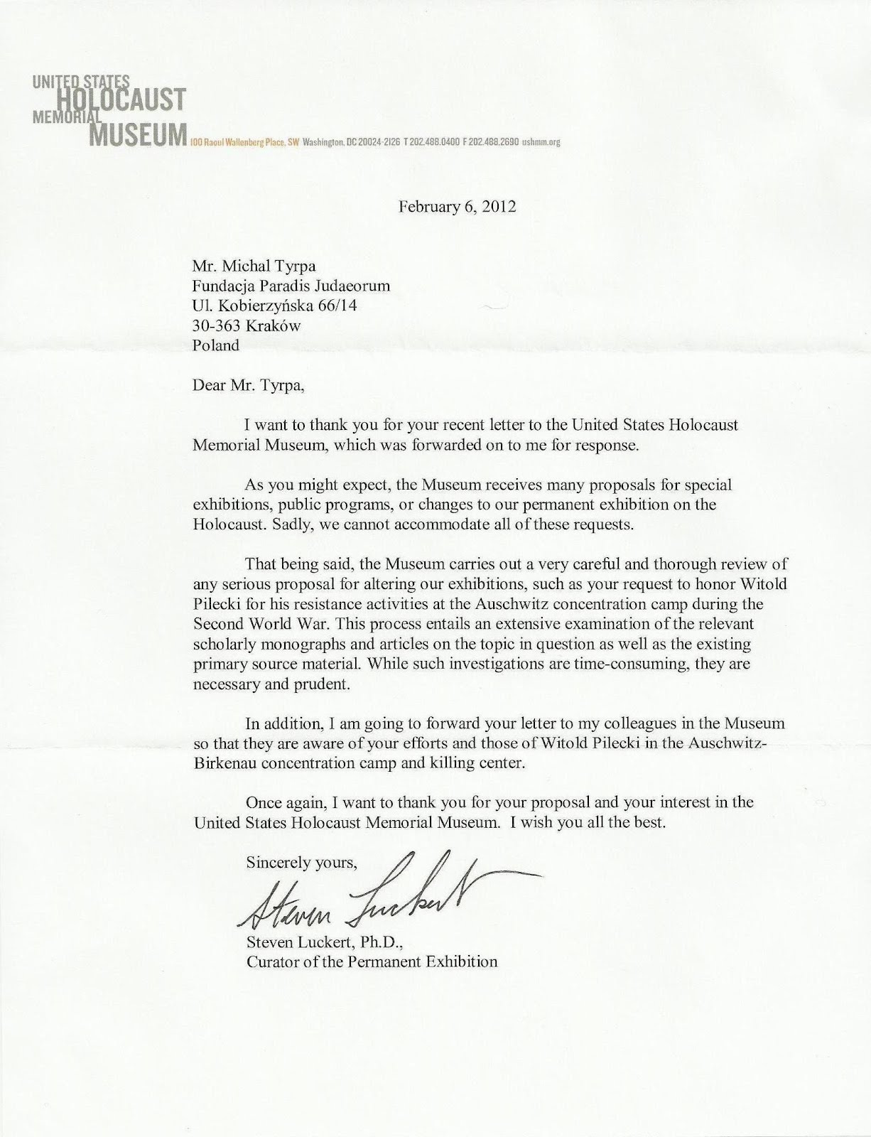W nawiązaniu do korespondencji kierowanej od stycznia b.r. przez przedstawicieli Fundacji Paradis Judaeorum i wolontariuszy akcji społecznej "Przypomnijmy o Rotmistrzu" ("Let's Reminisce About Witold Pilecki"), a także do artykułu pt. „Niepamięć o Auschwitz”, który ukazał się 22 kwietnia 2014 r. w krakowskim „Dzienniku Polskim”, vide skan tekstu (wraz z odnośnikami w opisie):