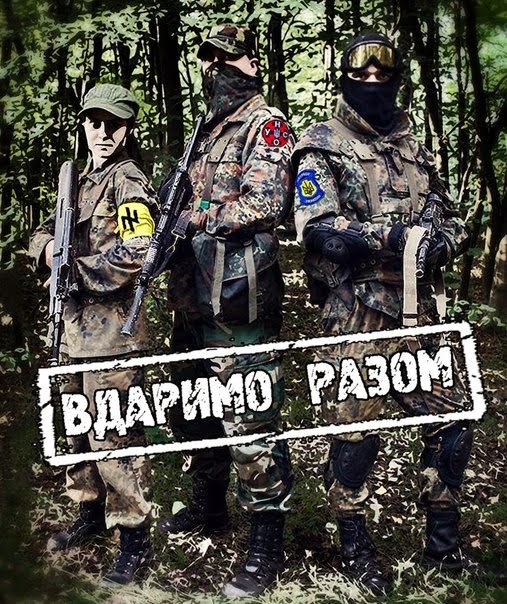 ["Uderzamy razem" - mobilizacyjny na wojnę z "separatystami" nacjonalistyczny "zjednoczeniowy" plakat oparty na fotce ze wspólnych manewrów SNA/Patriotów Ukrainy i UNSO ok. 2007; od lewej odznaki: SNA, UNSO, PU]