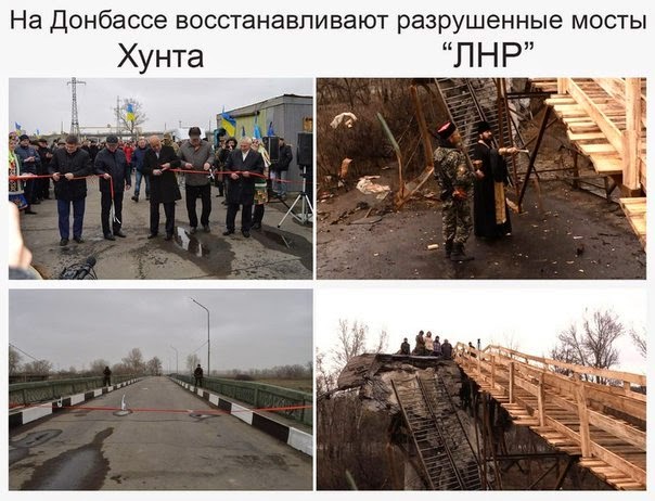 [ilustracja: odbudowa zniszczonych mostów w Donbasie - po lewej "junta", po prawej "ługańska republika ludowa"]