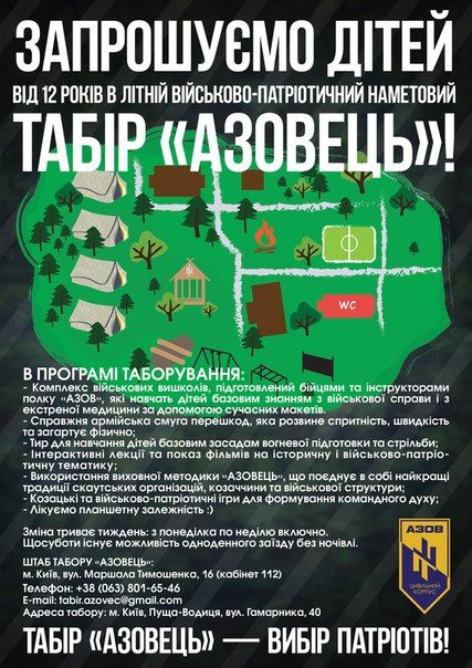 W sezonie letnim "azowcy" będący na zapleczu frontu zorganizowali rozłożony na turnusy obóz dla dzieci w wieku powyżej 12 lat. Przyjęta metodyka to połączenie klasycznego skautingu w wersji Baden-Powella - oswojenie z przyrodą, ćwiczenia z pierwszej pomocy, gry terenowe - ze szkoleniem strickte paramilitarnym poszerzonym o program zajęć tożsamościowych i historycznych.