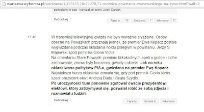 Trwa multimedialne bicie piany na temat skandalu jaki miał miejsce na warszawskich Powązkach Wojskowych w czasie składania wieńców przez delegacje różnych środowisk politycznych. Delegacje rządu, organów reprezentowanych przez PO - parlamentu - oraz, przede wszystkim, odchodzącego prezydenta miały być wygwizdane i wybuczane przez zgromadzony w powstańczych kwaterach tłum. Składający kwiaty jako ostatni prezydent-elekt dla odmiany został przywitany oklaskami.