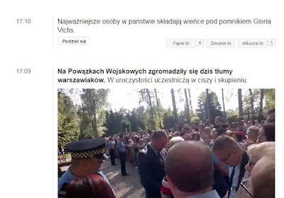 I cóż ja mam napisać, skoro - jak wspomniała Maryla - tam byłem, a Pan mi zza oceanu zapodaje jakieś vod "G.P."? Rzecz jest równie prosta jak kłamstwa Novosti Novorosji w sprawie milionpincetósmego rozbicia "Azowa" :) (nawiasem - właśnie przeformowują się z pułku w brygadę z własną szkołą oficerską na standardach NATO) Narracja mediów prorządowych jest taka, że w czasie składania kwiatów pod Gloria Victis o 17:00 zebrany na powstańczych kwaterach tłum wygwizdał i wybuczał przedstawicieli PO. Jest to oczywiste kłamstwo.