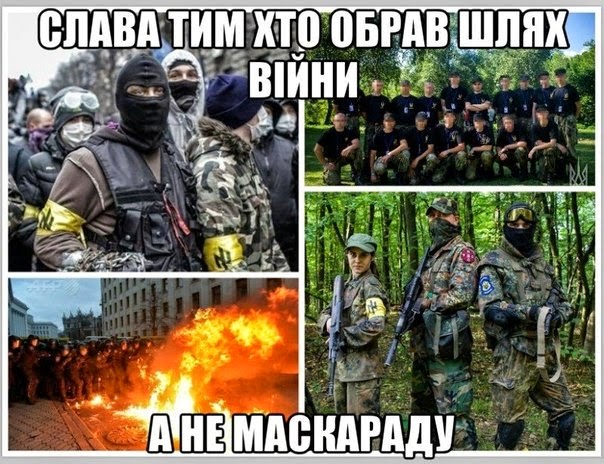 Trochę rosyjskiej propagandy… Jesteśmy wszyscy nazistami, syjonistami i islamistami! Dlaczego? Ponieważ nie zgadzamy się na aneksję 1/3 Ukrainy przez miłośników Wielkiej Rosji, antyfaszystów, byłych komunistów i innych sowieckich nostalgików. Ukraina jest jedna i niepodzielna. I taka pozostanie. Nie chcemy mafii Putina, Wielkiej Rosji, komunizmu, NATO ani Unii Europejskiej. Chcemy być niezależni, socjalistyczni (*w rozumieniu solidarystycznym, antymarksistowskim), nacjonalistyczni i chrześcijańscy. Chwała Ukrainie! Za wielką europejską rekonkwistę.