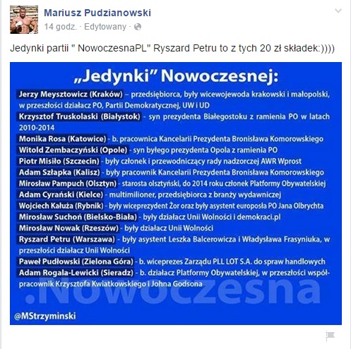 Warto jeszcze raz powtórzyć: A. Olechowski, L. Balcerowicz, W. Frasyniuk i ich środowiska (szczególnie te z okolic UD/UW) to ideowe i bezpośrednie zaplecze, niejako "ojcowie-założyciele" partii R. Petru. Wynika to z wypowiedzi zarówno R. Petru jak i pozostałych wymienionych... chociaż symptomatyczne jest, że o ile w czasie powstawania stowarzyszenia "nowoczesna.pl" (kwiecień, maj 2015 roku) ich rola była powszechnie wymieniana, to już w momencie rejestracji ruchu (partii) R. Petru (po wyborach prezydenckich, w których wygrał A. Duda) on sam zaczął się odcinać od swoich mentorów stwierdzając, iż "nowoczesna" to inicjatywa oddolna (sic!).