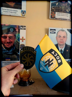 Podczas wizyty w Warszawie, goście z Zadrugi zaciągnęli "Sławiana" do "Ukraińskiego Świata" na Nowym Świecie, gdzie strzelił sobie kilka fotek na tle wystawki poświęconej ATO. Najwyraźniej jednak upatrzył sobie emblemat konkretnej jednostki...