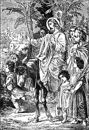 Już dawno odgrażano się Zbawicielowi, wskutek czego w ostatnich czasach Pan Jezus wcale do Jerozolimy nie chodził. Przybył tam dopiero na cztery dni przed Wielkanocą, to jest dniem, w którym na mocy dawnego zwyczaju zabijano baranka wielkanocnego. Gdy przyszedł do Betfagi pod górą Oliwną, wysłał dwóch uczniów do Betanii po oślicę, wsiadł na nią i pojechał do Jerozolimy, aby się ziściła przepowiednia Zachariasza proroka: "Raduj się wielce, córko Syjonu! Wykrzykuj, córko Jeruzalem! Oto król twój przyjdzie tobie sprawiedliwy i Zbawiciel, on ubogi, a wsiadający na oślicę i na źrebię, syna oślicy" (Zachariasz 9, 9).