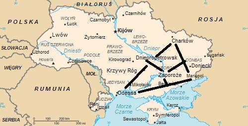 [dla lepszej orientacji Czytelnika wymienione w notce miejsca ćwiczeń połączyłem liniami... dodatkowo z leżącego w centrum zaznaczonego obszaru Zaporoża wyprowadziłem kierunki ewentualnego wsparcia sił defensywnych lub... wyprowadzenia zgrupowania sił ukraińskich w rejon "graniczący" z terytoriami okupowanymi przez "separatystów" - kliknij w grafikę by powiększyć]