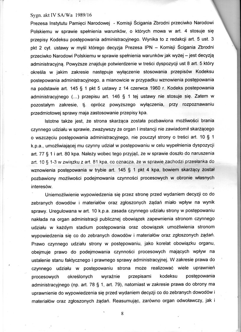 Pisemne uzasadnienie wyroku jest dla IPN miażdżące. Instytut ma obowiązek stosowania przepisów KPA praktycznie w całości, włącznie z udostępnieniem dokumentów SB, ma umożliwić stronie prawo do składania wniosków dowodowych, uczestniczyć w postępowaniu dowodowym, przedstawić wyjaśnienia itd.
