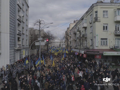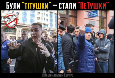 Chodziło o niedopuszczenie manifestujących na taką odległość od sceny, by byli słyszalni. Podobnie do "Tituszek" z 2014, dzisiejsze "PeTuszki" po atakach na protestujących chroniły się za kordonem sił porządkowych - sam nie wiem, czy nazywać je policją, czy milicją. Organizatorzy byli zdeterminowani, by zachować pokojowy charakter demonstracji, więc ludzie z czoła kolumny po prostu wzięli się pod ręce uniemożliwiając "PeTuszkom" "wbice się" w tłum. Obecni postronni mieszkańcy miasta poparli "azowców" twierdząc w wypowiedziach dla obecnych na miejscu dziennikarzy, że przemawiających w imieniu protestujących znają ze sklepu, czy dzielnicy, natomiast agresorzy są obcy. Po namierzeniu ich samochodów i busów i sfotografowaniu numerów rejestracyjnych okazało się, że przyjechali z Białej Cerkwi, czyli miasta z którego pochodzi... Wadim Tituszko, od którego nazwiska wzięła się nazwa antymajdanowej bandyterki z 2014. Taki uśmiech historii.
