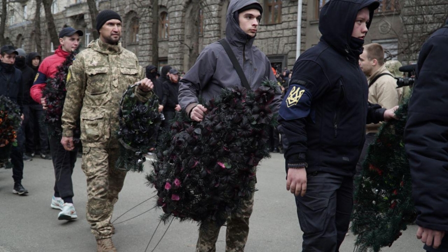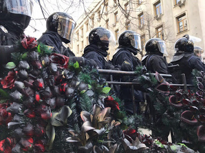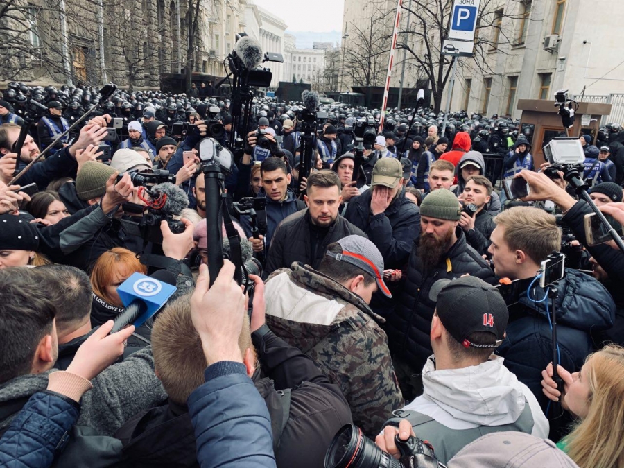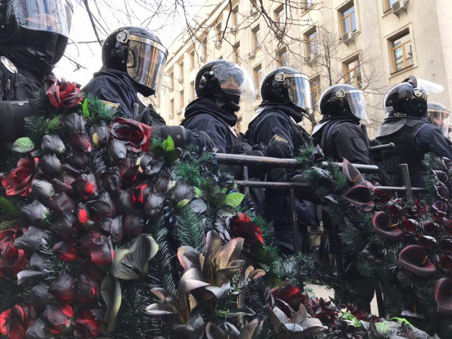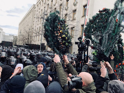 Na protestujących po raz kolejny, niezgodnie z ukraińskim prawem (bez decyzji sądu) czekał kordon blokujący całą ulicę. Przygotowani na to "azowcy" i weterani złożyli przed kordonem symboliczne żałobne wieńce z informacją, że właśnie następuje pochówek reżimu Poroszenki.