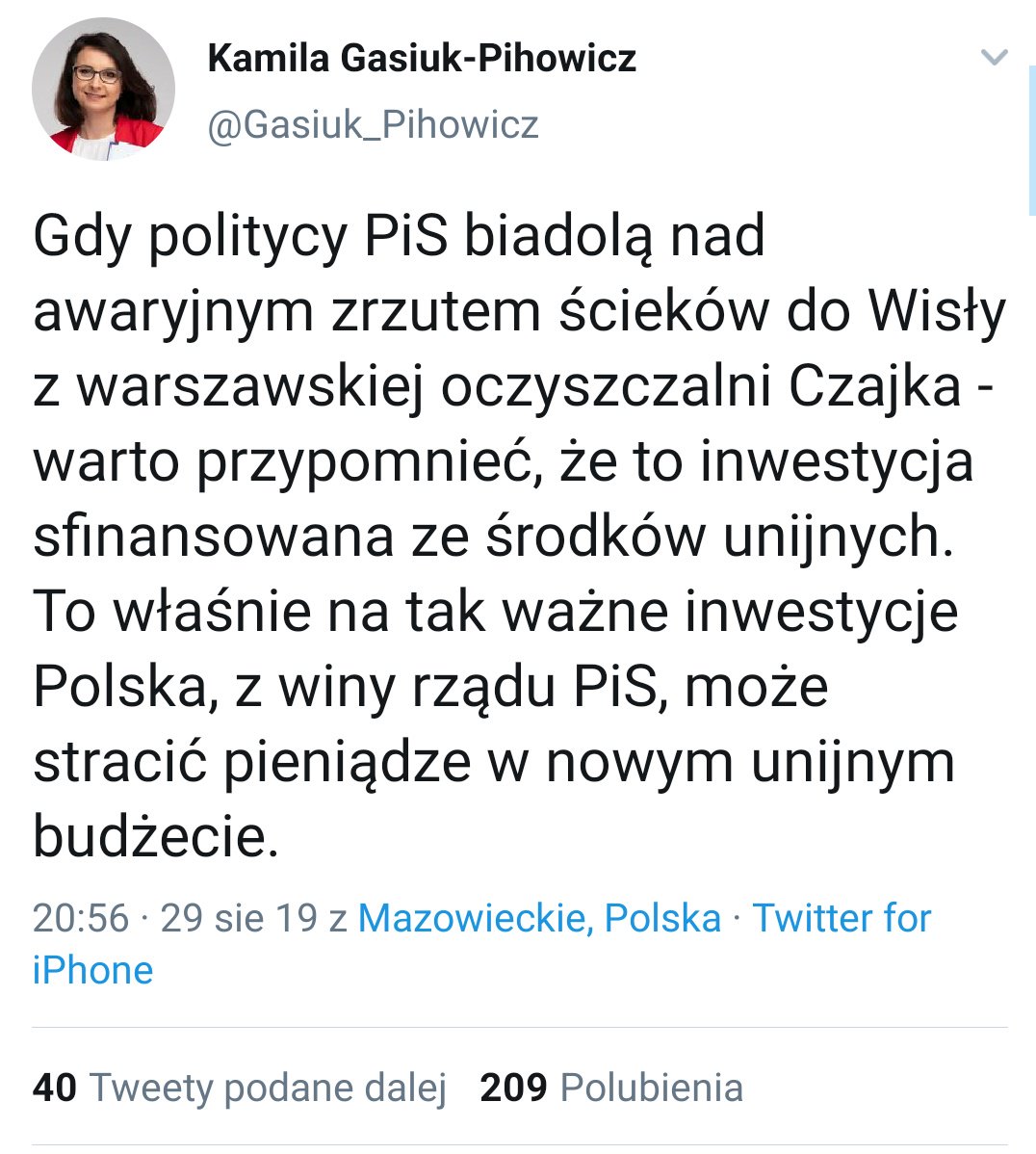 awarii w oczyszczalni ścieków „Czajka”, przystał na propozycję rządu.