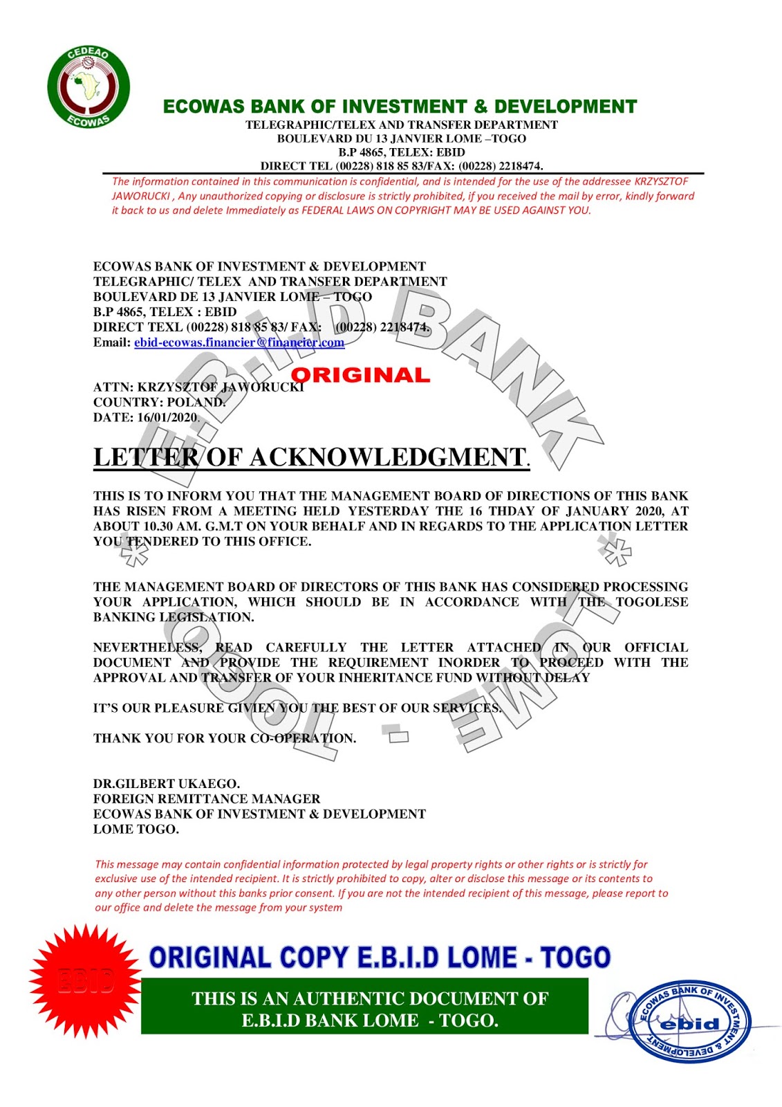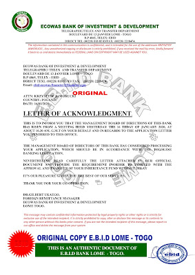 W międzyczasie zostałem zalany potokiem e-maili, w których to niby sam afrykański bank (w tym wypadku ECOWAS - Bank Centralny Krajów Afryki Zachodniej) przesyłał mi wiarygodnie wyglądające dokumenty bankowe, gdzie również zapewniał mnie, że czeka na mnie fortuna... jeżeli zapłacę 2.500.USD poprzez Western Union, wskazując mi jako odbiorcę osobę prywatną nazywaną przez "bank" "kasjerem bankowym". Oczywiście te wszystkie dokumenty to były normalne fałszywki, ale dla niezorientowanej osoby naprawdę mogły wyglądać na prawdziwe. Do tego były "podpisywane" przez osobę, która naprawdę istnieje.