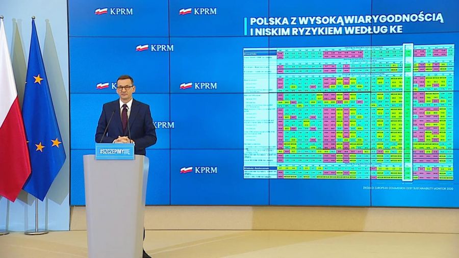 "wskaźniki Polski „na zielono”. Wysoka wiarygodność i niskie ryzyko budżetowe: "Jeśli spojrzeć na „Debt Sustainability Monitor 2020”, czyli „Monitor stabilności zadłużenia 2020” przygotowany przez KE, to szef polskiego rządu rzeczywiście ma powody do satysfakcji. Polityka gospodarcza ostatnich lat doprowadziła do sytuacji, w której nasz kraj jako jedyny w całej UE jest całkowicie „na zielono”, jeśli chodzi o wskaźniki stabilności, wiarygodności i niskiego stanu ryzyka finansów publicznych."
