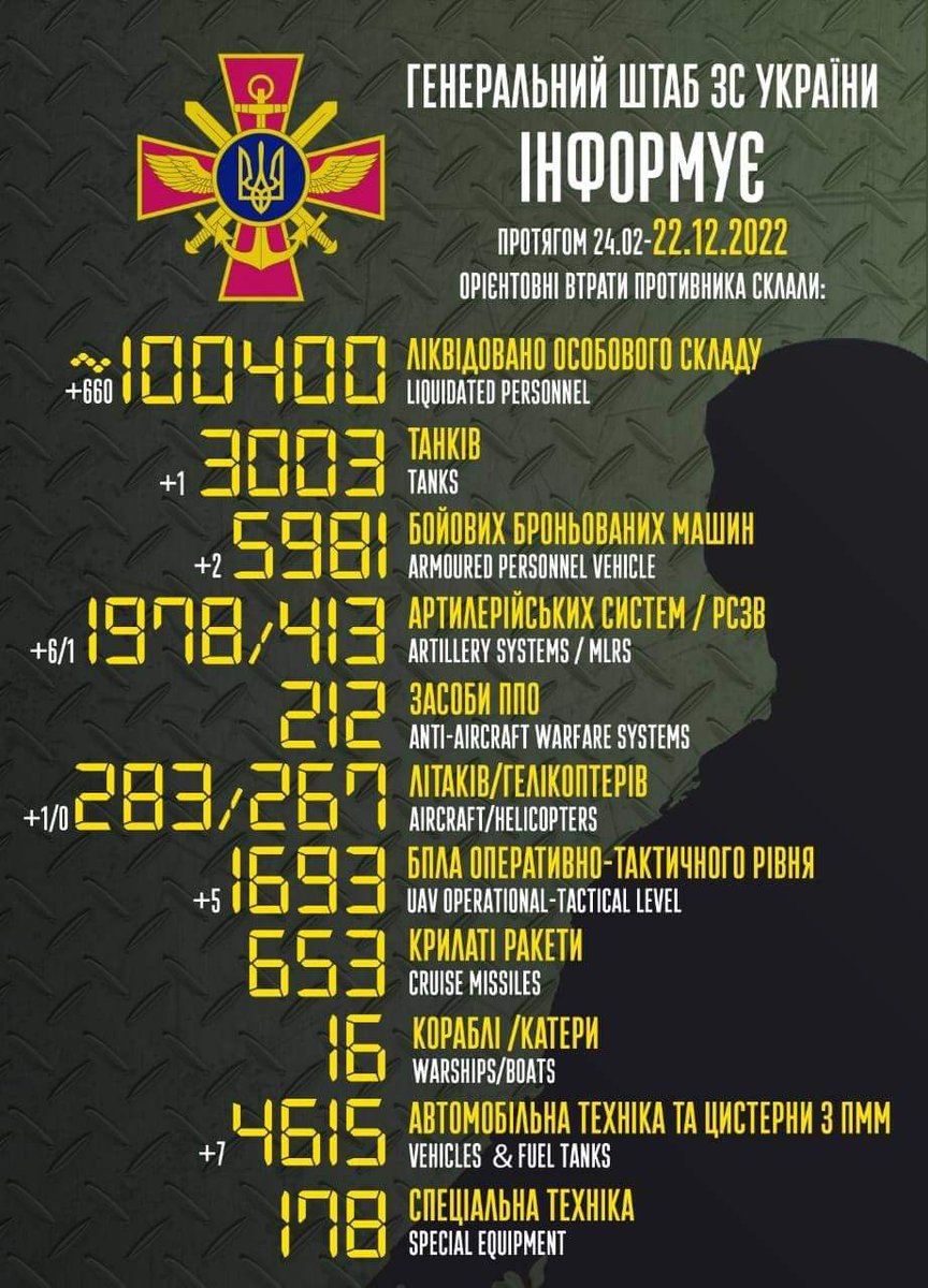 12. Wojenne straty Rosji do 22 grudnia 2022 roku
